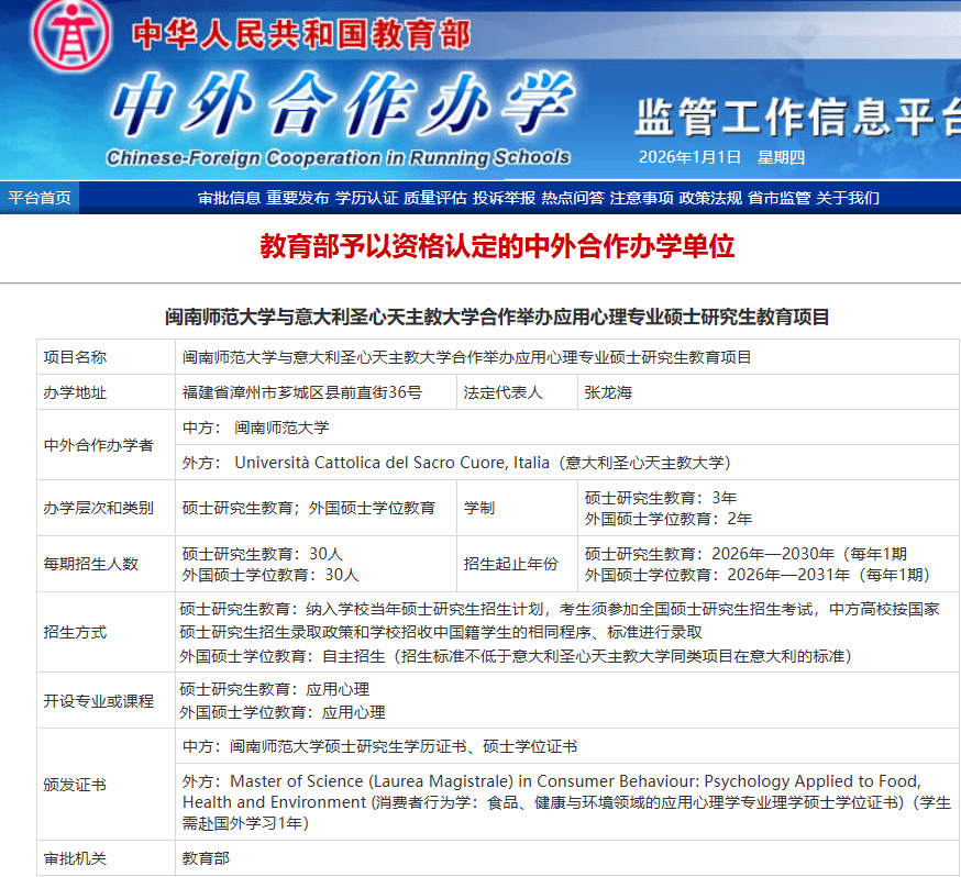 近日,教育部正式审批通过我校与意大利圣心大学合作举办应用心理专业硕士研究生教育项目。该项目是我校...