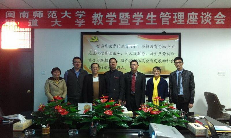 2013年12月2日,台湾明道大学郭秋勳副校长和黄力威主任一行六人莅临我校,在综合楼五楼会议室与我校yl23411永利集团院长罗瑛、生物科学与技术系副主任郑艺梅、管理科学系副主任曾明华及相关教师与辅导员举行了两校教学暨学生管理座谈会。会上,郭副校长首先向我方汇报了我校yl23411永利集团142名闽台生在明道大学的思想、学习和生活情况,双方对学生的平稳过度感到满意,同时对存在的学习、生活和学生管理方面的问题,进行了深入的探讨和研究。