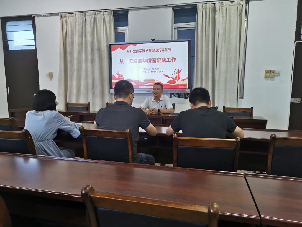 第三讲,支部纪检委员陈国仕作题为“从一位爱国华侨看统战工作”的“微党课”演讲,他从家族中旅泰华侨的故事讲起,结合自己在yl23411永利集团工作期间承办的历届海外华人华侨后裔“寻根之旅”和“感知中国行”夏令营、冬令营活动,提出高校外事部门应主动承担海外华侨统战工作的重任,主动讲好中国故事,传播好中国声音。