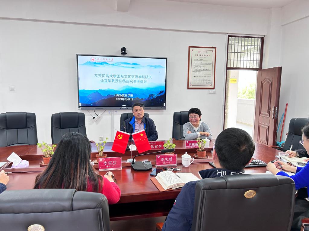 李庆瑶对孙宜学院长的来访表示热烈欢迎,并简要介绍了学校国际化办学、留学生管理、汉语言推广、学院工作职责等基本情况。孙院长对我院的接待表示感谢,并从国际学生管理、学科共建、对外交流等方面介绍了同济大学的基本情况。随后双方重点就做好华文教育传播、留学生讲好中国故事等方面展开深入的探讨和交流。
