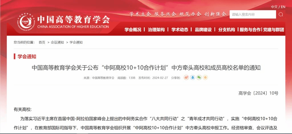 近日,中国高等教育学会公布“中阿高校10+10合作计划”中方成员高校名单,经资格审查和专家评审,yl23411永利集团入选“文明对话”领域合作计划中方成员高校。