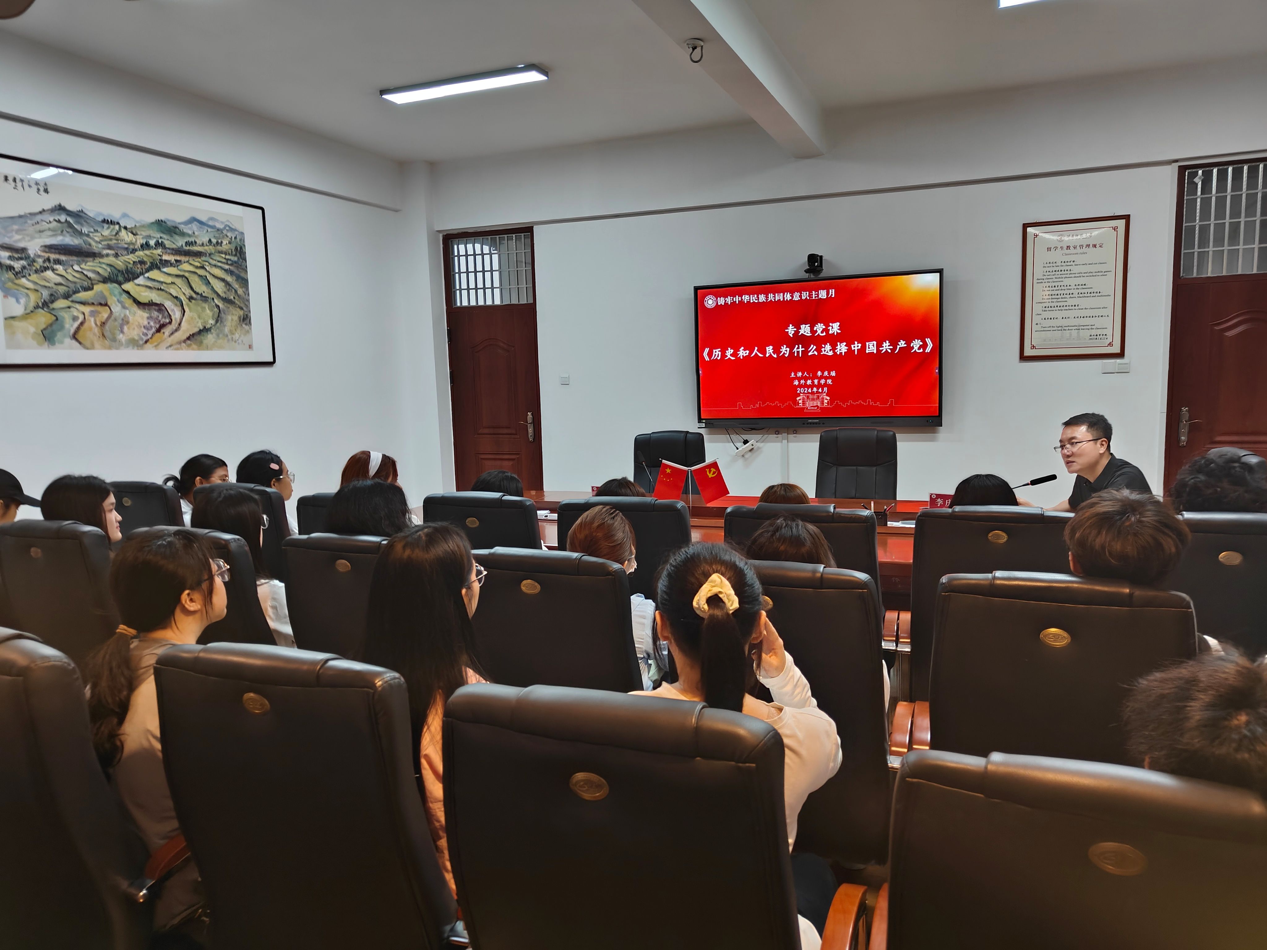 为深入学习贯彻习近平总书记在中共中央政治局第九次集体学习时的重要讲话和中央民族工作会议精神,进一步铸牢中华民族共同体意识,加强大学生的国情教育,丰富人文交流内容,提升宣传教育实效,4月18日下午,yl23411永利集团院长李庆瑶为留学生、港澳台学生及国际项目生讲授题为《历史和人民为什么选择中国共产党》的形势政策课。