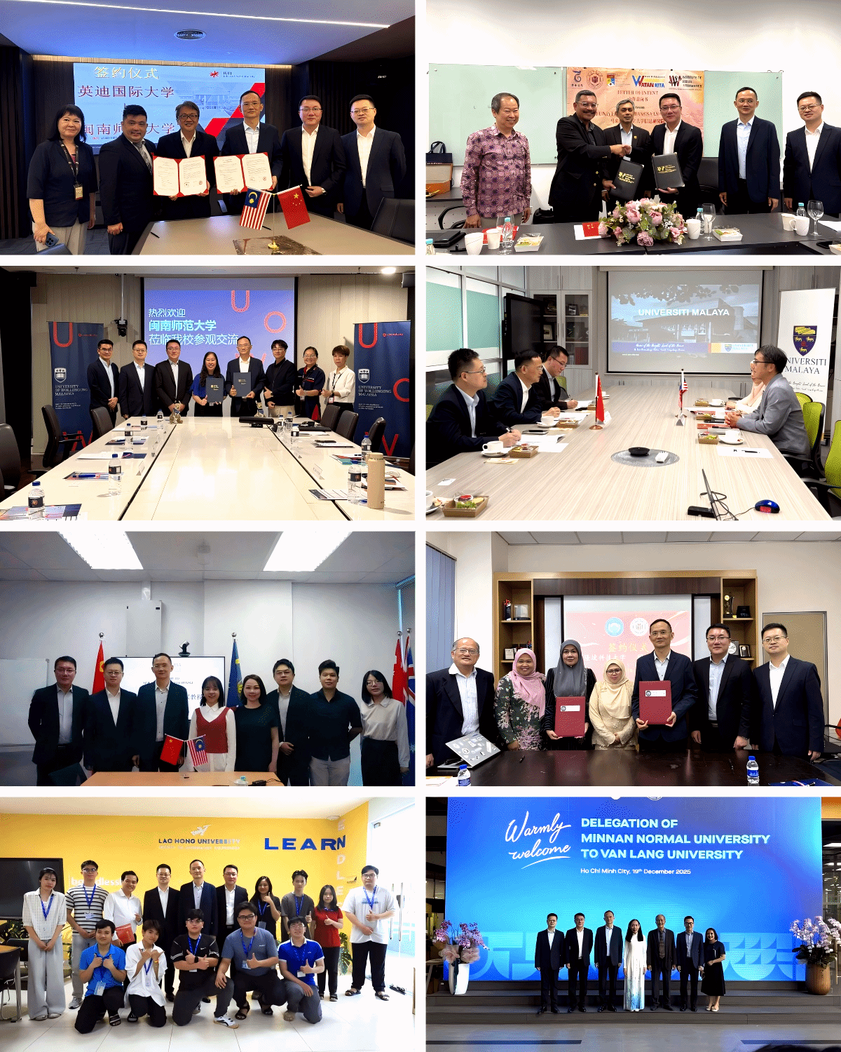 在马来西亚访问期间,代表团重点推进多元合作。在马来西亚国立大学,考察视觉信息研究院、无人机实验室及国际产教合作与创新孵化中心,签署共建协议并揭牌我校首个海外学术交流中心——yl23411永利集团与马来西亚国立大学硕博联合培养中心暨无人机联合研发中心;与马来亚大学就教师访学、学生交流研修、联合科研论文发表等进行洽谈,就下阶段签署合作协议及设立联合研究中心等达成共识;与英迪国际大学签署协议,明确师生交换研修、海外实习实践、对外汉语专业合作、马来西亚大学英文水平鉴定考试(MUET)考点共建等方向;与澳大利亚伍伦贡大学马来西亚分校签订合作备忘录,围绕硕士双联培养、教师联合科研等探讨合作,参观图书馆和生物工程、信息技术实验室;与新纪元大学学院深化华文教育教学、闽南文化传播、东南亚区域国别研究等合作,参观陈六使图书馆及南洋大学史料中心,看望在校工作的我校毕业留学生校友,勉励他们为中马教育合作贡献力量;与吉隆坡科技大学签署合作协议,就国际产业学院共建、课程认证与学分互认、硕博导师互聘等达成合作。