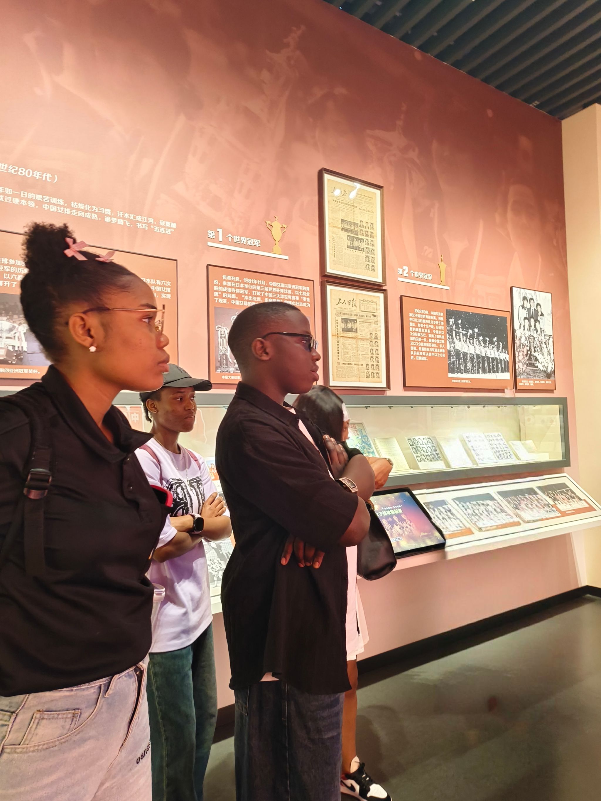 “竹棚传奇”展区里,老照片与文字诉说着女排姑娘们“竹棚起家”的艰辛;“殷殷嘱托”板块中,字里行间满是对女排的关怀与期许。展柜里,一座座闪耀的冠军奖杯静静陈列,从世界杯到奥运会,每一座奖杯背后都是汗水与坚持的故事,留学生凑近玻璃展柜,认真聆听奖杯背后的夺冠历程。